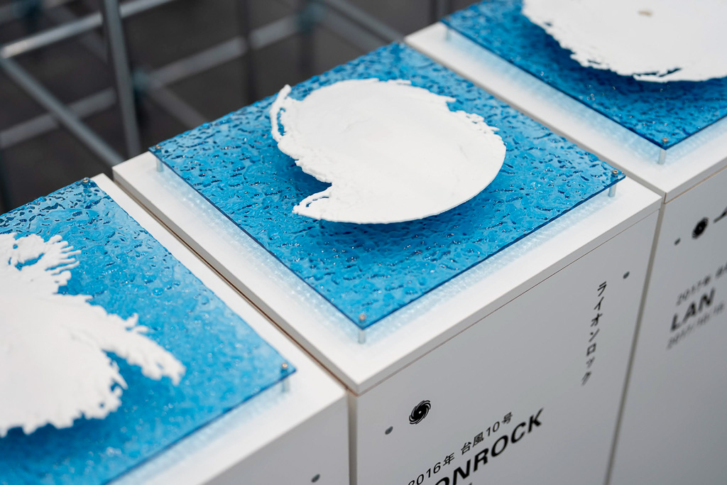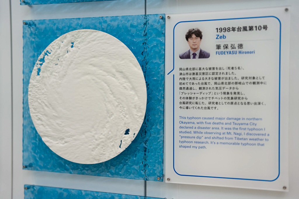 研究者たちが選んだ「印象深い台風」を、台風標本と共に紹介。台風ごとの違いや特徴を見比べながら観察することができます。そのほか、台風研究にまつわる模型や実験道具、関連書籍などを展示しました。
