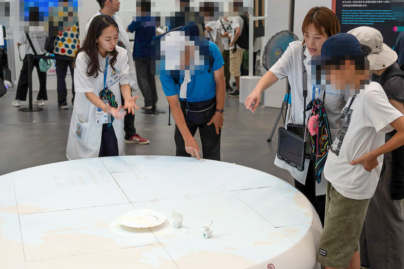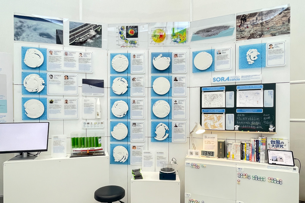 台風の脅威から解放された、安全で豊かな社会の実現を目指し、台風への介入方法の効果や安全性についての研究が進められています。2050年までに台風を脅威から恵みへと変え、誰もが安心して暮らせる未来を、台風制御のシミュレーションや壁面展示を通じて展示しました。