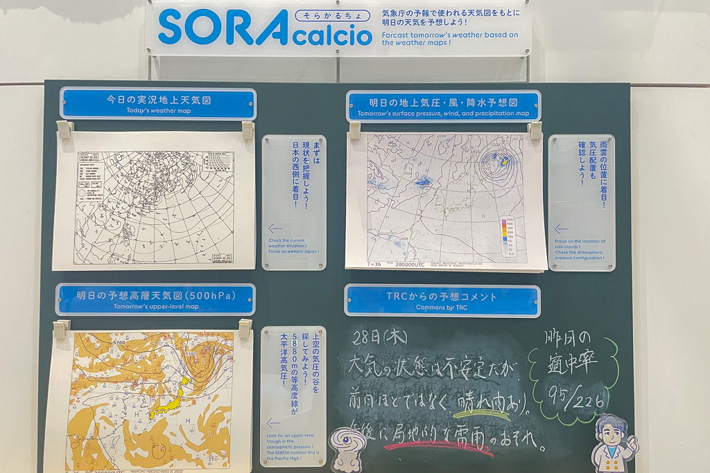 天気図を見ながら明日正午の天気を予想するSORAcalcio(そらかるちょ)コーナーも設置。天気図の見方について学びながら、「快晴」「晴れ」「くもり」「雨」のうち1つを予想します。