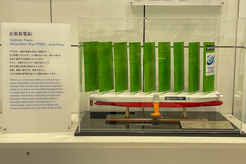 「もし台風を制御できたら?」という仮想の一手として、「台風発電船」による台風追跡や、台風の上空からインパクト物質を落とす飛行機の動きなどを、模型を用いてシミュレーションしました。