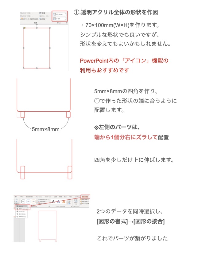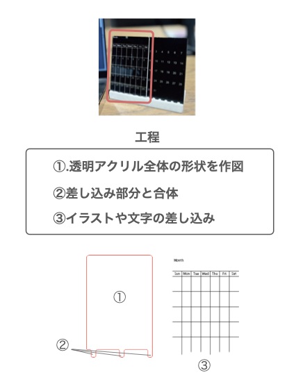 二種類のアクリルに差し込み部分を設けることで、3Dプリンター製の土台に対して正確な位置でセットできるように設計します。カレンダー部分はPowerPointでデータを作成しており、数字やテキスト部分を好みのフォントでつくることができます。またアクリル全体のアウトラインも好みの形状にアレンジすることができます。