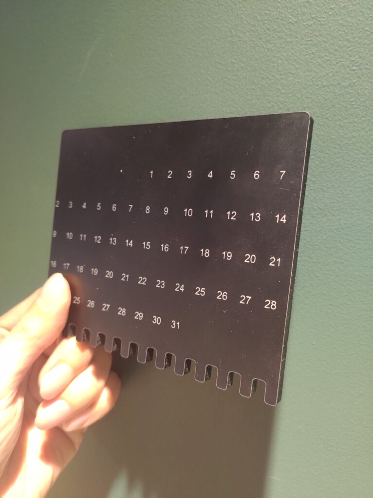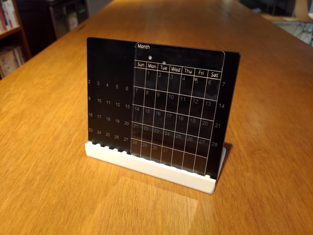 カレンダー部分は黒アクリルに日付を表す数字を彫刻。