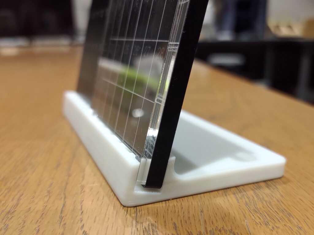 グリッドと曜日が彫刻された透明アクリルを重ねて、3Dプリンター製の土台にセットしています。透明アクリルの差し込み位置を変更することで、グリッドと日付の位置関係が変わり、さまざまな月に対応できます。