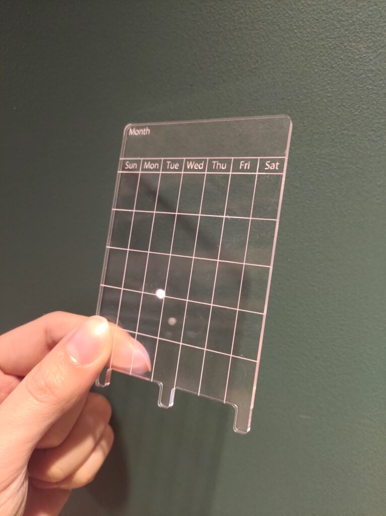 見栄えや視認性が重要なカレンダー部分にはテキストやイラストを鮮明に彫刻できるアクリルを使用。
